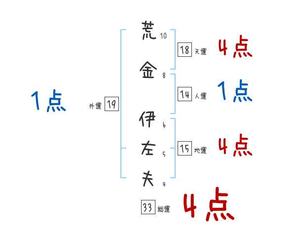 天運![]() | 荒金伊左夫さんの天運は18画の4つ星!情熱的で剛気。忍耐力があり信頼される。 家系が持つ宿命的な運勢を表します。祖先から受け継いだ苗字ですので自分の力が及びません。家柄を象徴します。 |