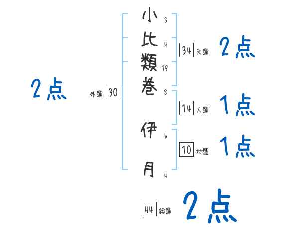 外運![]() | 小比類巻伊月さんの外運は30画の2つ星!浮き沈みの激しさに注意しましょう。 生活面を象徴する運勢です。外部から受ける影響力を表し、結婚運、家庭運や職場、環境への順応性を表します。 |