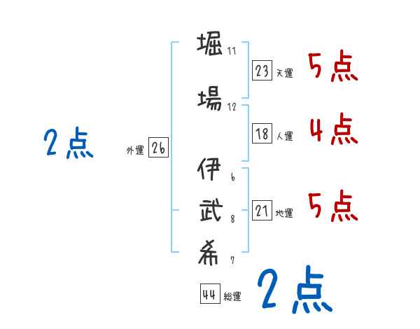 外運![]() | 堀場伊武希さんの外運は26画の2つ星!波瀾万丈かも。信頼できる人を大事にしましょう。 生活面を象徴する運勢です。外部から受ける影響力を表し、結婚運、家庭運や職場、環境への順応性を表します。 |