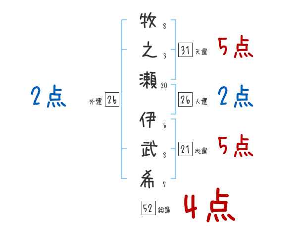 総運![]() | 牧之瀬伊武希さんの総運は52画の4つ星!先見性と独創性に優れ考える力がある。強運の持ち主。 あなたの人生を表す1番重要な運勢です。生涯を通じて影響する総合運となり、主に50歳以降の晩年期に影響を及ぼします。 |