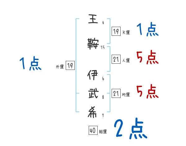 天運![]() | 王鞍伊武希さんの天運は19画の1つ星!優れた才能を持ちますが、協調性が足りないことも。周りの人と協力する事を意識しましょう。 家系が持つ宿命的な運勢を表します。祖先から受け継いだ苗字ですので自分の力が及びません。家柄を象徴します。 |