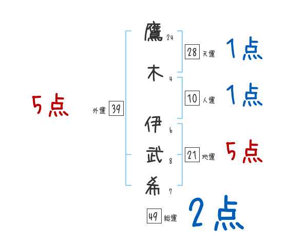 天運![]() | 鷹木伊武希さんの天運は28画の1つ星!家庭環境に注意。スポーツで活躍できる能力があるかも。 家系が持つ宿命的な運勢を表します。祖先から受け継いだ苗字ですので自分の力が及びません。家柄を象徴します。 |