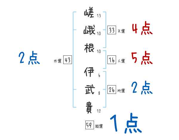 人運![]() | 嵯峨根伊武貴さんの人運は16画の5つ星!人望が厚く大きく発展する。逆転成功が見える。 性格や才能などを表す2番目に重要な運勢です。人間関係や協調性、社会的な成功に影響します。主に20歳から50歳ぐらいまでの中年期の運勢を表します。 |