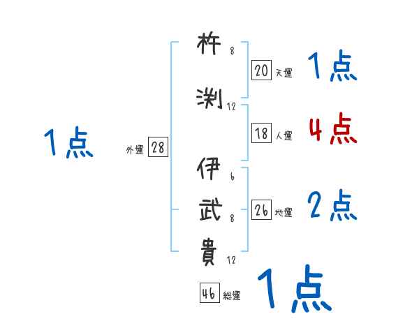 外運![]() | 杵渕伊武貴さんの外運は28画の1つ星!家庭環境に注意。スポーツで活躍できる能力があるかも。 生活面を象徴する運勢です。外部から受ける影響力を表し、結婚運、家庭運や職場、環境への順応性を表します。 |