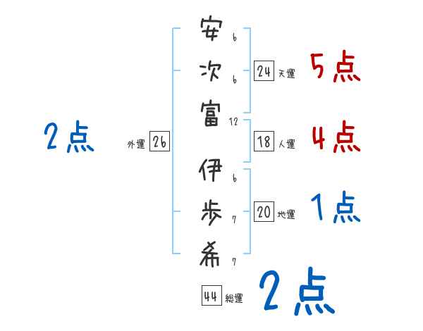 外運![]() | 安次富伊歩希さんの外運は26画の2つ星!波瀾万丈かも。信頼できる人を大事にしましょう。 生活面を象徴する運勢です。外部から受ける影響力を表し、結婚運、家庭運や職場、環境への順応性を表します。 |
