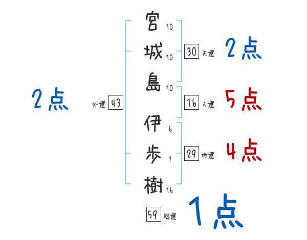 天運![]() | 宮城島伊歩樹さんの天運は30画の2つ星!浮き沈みの激しさに注意しましょう。 家系が持つ宿命的な運勢を表します。祖先から受け継いだ苗字ですので自分の力が及びません。家柄を象徴します。 |