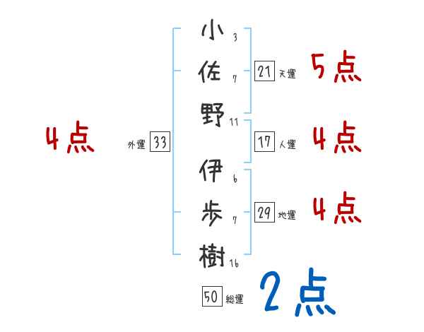 外運![]() | 小佐野伊歩樹さんの外運は33画の4つ星!権力志向でプライドが高い。勇気があり運を切り開き成功する。 生活面を象徴する運勢です。外部から受ける影響力を表し、結婚運、家庭運や職場、環境への順応性を表します。 |