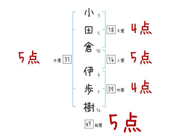 総運![]() | 小田倉伊歩樹さんの総運は47画の5つ星!実力が開花し発展する円満な人生。財に恵まれる。 あなたの人生を表す1番重要な運勢です。生涯を通じて影響する総合運となり、主に50歳以降の晩年期に影響を及ぼします。 |