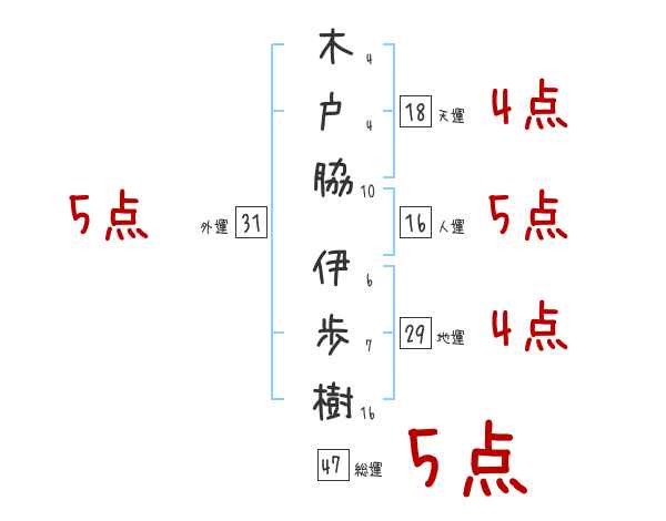 外運![]() | 木戸脇伊歩樹さんの外運は31画の5つ星!社交性があり判断力に優れる。順風満帆な人生で円満な生活。 生活面を象徴する運勢です。外部から受ける影響力を表し、結婚運、家庭運や職場、環境への順応性を表します。 |