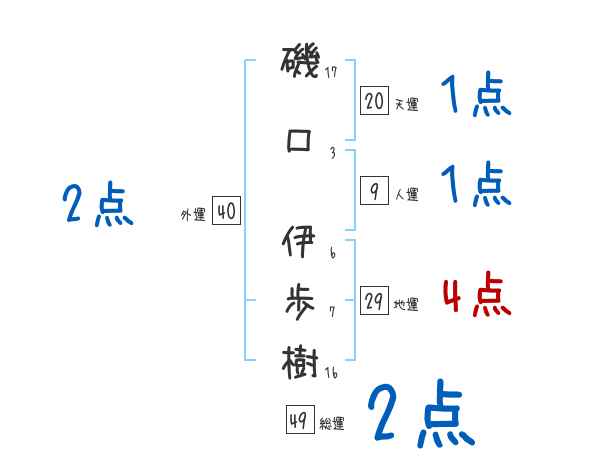 地運![]() | 磯口伊歩樹さんの地運は29画の4つ星!完全主義で才能がある。厳格な心の持ち主。 個性を表す基礎的な運勢です。性格形成や対人関係、行動力など家庭環境に影響されます。主に誕生してから20歳くらいまでの若年期の運勢を表します。 |