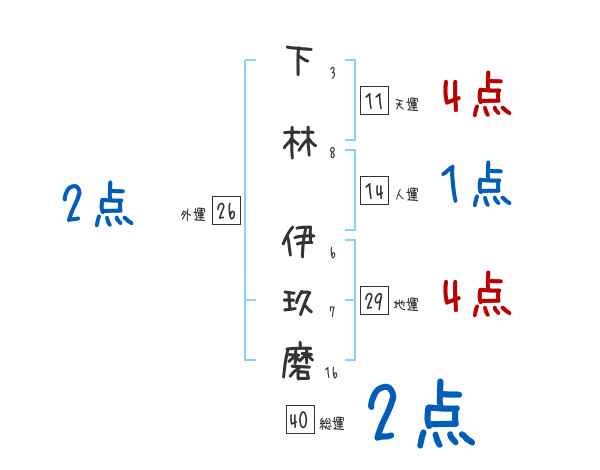 天運![]() | 下林伊玖磨さんの天運は11画の4つ星!着実に富や地位を得る幸運な人生。 家系が持つ宿命的な運勢を表します。祖先から受け継いだ苗字ですので自分の力が及びません。家柄を象徴します。 |