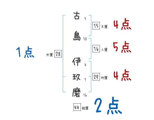 人運![]() | 古島伊玖磨さんの人運は16画の5つ星!人望が厚く大きく発展する。逆転成功が見える。 性格や才能などを表す2番目に重要な運勢です。人間関係や協調性、社会的な成功に影響します。主に20歳から50歳ぐらいまでの中年期の運勢を表します。 |