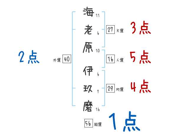 人運![]() | 海老原伊玖磨さんの人運は16画の5つ星!人望が厚く大きく発展する。逆転成功が見える。 性格や才能などを表す2番目に重要な運勢です。人間関係や協調性、社会的な成功に影響します。主に20歳から50歳ぐらいまでの中年期の運勢を表します。 |