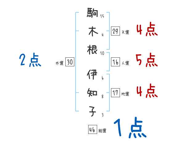 総運![]() | 駒木根伊知子さんの総運は46画の1つ星!迷走することが多く苦労するかも。目先のことにとらわれないように。 あなたの人生を表す1番重要な運勢です。生涯を通じて影響する総合運となり、主に50歳以降の晩年期に影響を及ぼします。 |