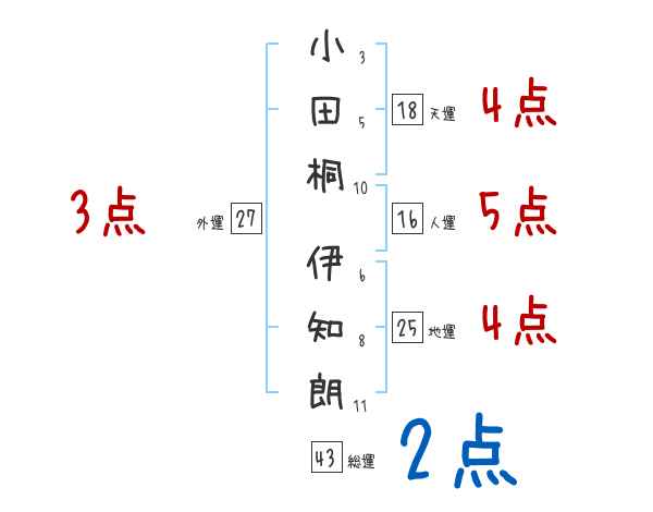 天運![]() | 小田桐伊知朗さんの天運は18画の4つ星!情熱的で剛気。忍耐力があり信頼される。 家系が持つ宿命的な運勢を表します。祖先から受け継いだ苗字ですので自分の力が及びません。家柄を象徴します。 |