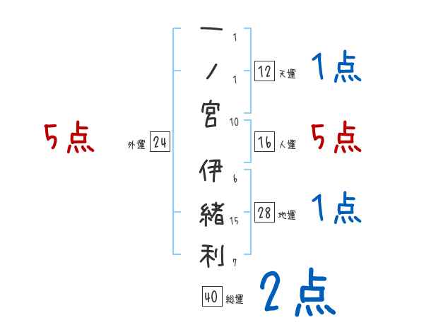 外運![]() | 一ノ宮伊緒利さんの外運は24画の5つ星!家庭運が良く順調な人生。金運にも恵まれる。 生活面を象徴する運勢です。外部から受ける影響力を表し、結婚運、家庭運や職場、環境への順応性を表します。 |