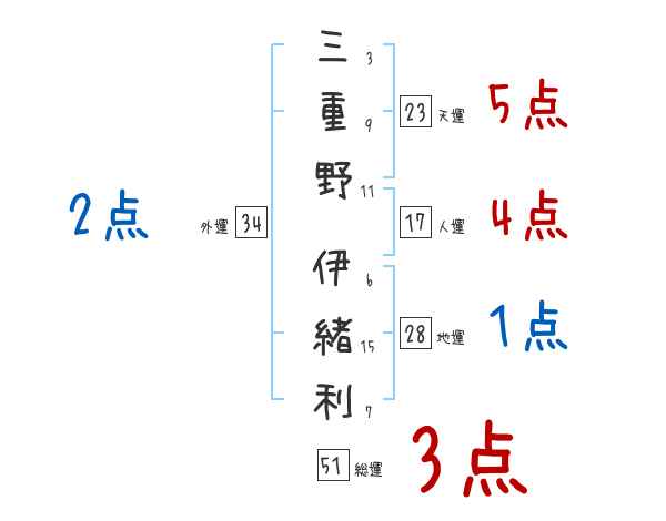 天運![]() | 三重野伊緒利さんの天運は23画の5つ星!想像力に優れ活力がある。一代で成功し名誉を手に入れる。 家系が持つ宿命的な運勢を表します。祖先から受け継いだ苗字ですので自分の力が及びません。家柄を象徴します。 |