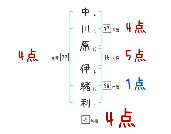 外運![]() | 中川原伊緒利さんの外運は29画の4つ星!完全主義で才能がある。厳格な心の持ち主。 生活面を象徴する運勢です。外部から受ける影響力を表し、結婚運、家庭運や職場、環境への順応性を表します。 |