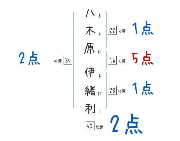人運![]() | 八木原伊緒利さんの人運は16画の5つ星!人望が厚く大きく発展する。逆転成功が見える。 性格や才能などを表す2番目に重要な運勢です。人間関係や協調性、社会的な成功に影響します。主に20歳から50歳ぐらいまでの中年期の運勢を表します。 |