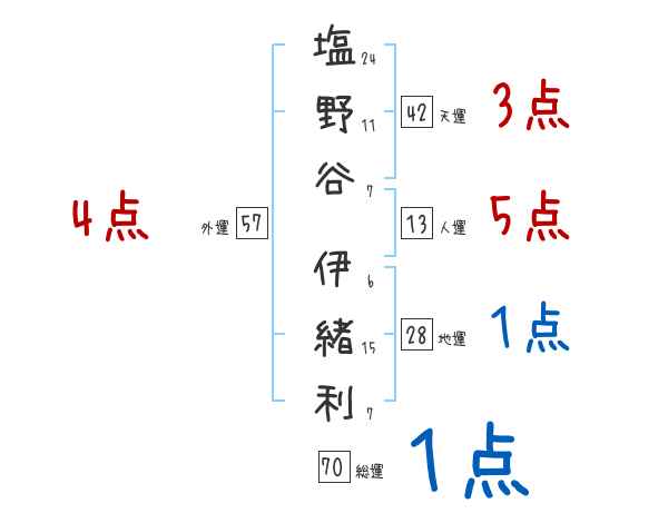 人運![]() | 塩野谷伊緒利さんの人運は13画の5つ星!才能に恵まれ人気がある。名声を手に入れる。円満な人生。 性格や才能などを表す2番目に重要な運勢です。人間関係や協調性、社会的な成功に影響します。主に20歳から50歳ぐらいまでの中年期の運勢を表します。 |