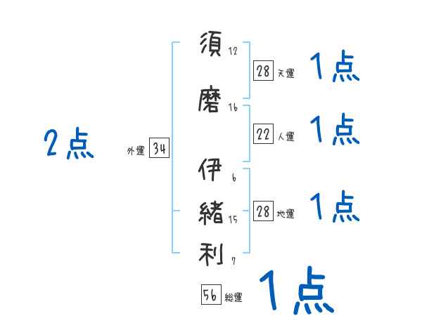 天運![]() | 須磨伊緒利さんの天運は28画の1つ星!家庭環境に注意。スポーツで活躍できる能力があるかも。 家系が持つ宿命的な運勢を表します。祖先から受け継いだ苗字ですので自分の力が及びません。家柄を象徴します。 |