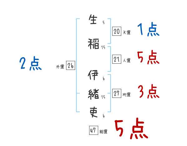 総運![]() | 生稲伊緒吏さんの総運は47画の5つ星!実力が開花し発展する円満な人生。財に恵まれる。 あなたの人生を表す1番重要な運勢です。生涯を通じて影響する総合運となり、主に50歳以降の晩年期に影響を及ぼします。 |