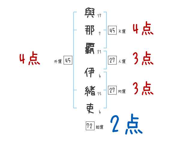 天運![]() | 與那覇伊緒吏さんの天運は45画の4つ星!もくもくと物事を進め達成する。地味な努力家。 家系が持つ宿命的な運勢を表します。祖先から受け継いだ苗字ですので自分の力が及びません。家柄を象徴します。 |