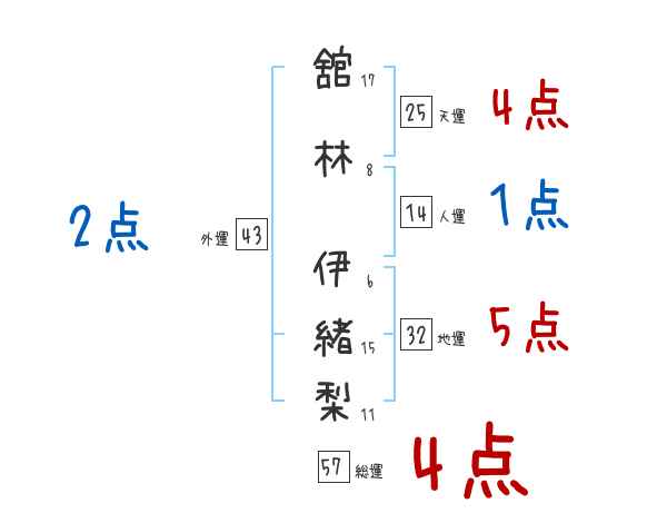 外運![]() | 舘林伊緒梨さんの外運は43画の2つ星!頑固な性格で独立心が強いかも。やや非現実的で浪費に注意しましょう。 生活面を象徴する運勢です。外部から受ける影響力を表し、結婚運、家庭運や職場、環境への順応性を表します。 |