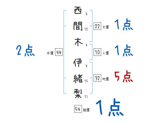 外運![]() | 西間木伊緒梨さんの外運は44画の2つ星!誠実で慎重な性格。物事を考えすぎないように注意しましょう。 生活面を象徴する運勢です。外部から受ける影響力を表し、結婚運、家庭運や職場、環境への順応性を表します。 |