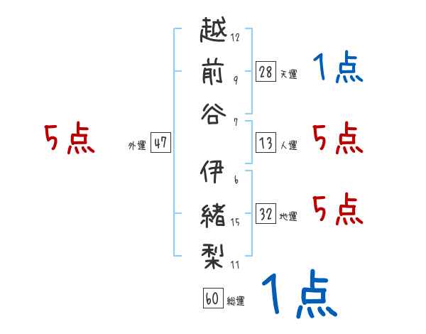 人運![]() | 越前谷伊緒梨さんの人運は13画の5つ星!才能に恵まれ人気がある。名声を手に入れる。円満な人生。 性格や才能などを表す2番目に重要な運勢です。人間関係や協調性、社会的な成功に影響します。主に20歳から50歳ぐらいまでの中年期の運勢を表します。 |
