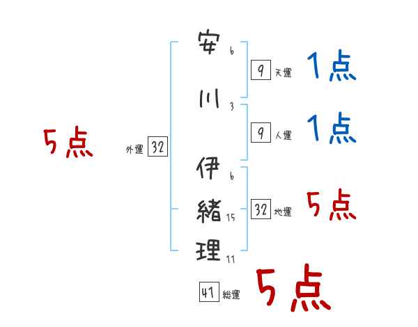外運![]() | 安川伊緒理さんの外運は32画の5つ星!柔軟性があり成功する。チャンスが多く金運が良い。 生活面を象徴する運勢です。外部から受ける影響力を表し、結婚運、家庭運や職場、環境への順応性を表します。 |