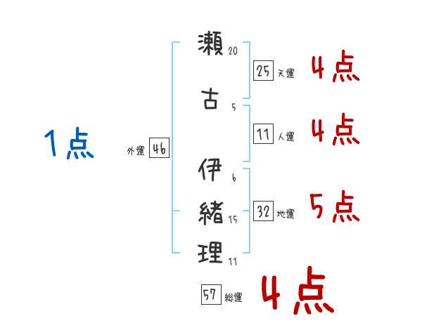 外運![]() | 瀬古伊緒理さんの外運は46画の1つ星!迷走することが多く苦労するかも。目先のことにとらわれないように。 生活面を象徴する運勢です。外部から受ける影響力を表し、結婚運、家庭運や職場、環境への順応性を表します。 |