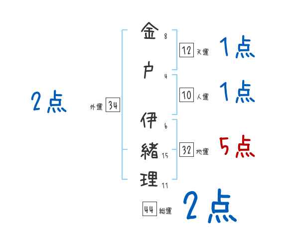 天運![]() | 金戸伊緒理さんの天運は12画の1つ星!簡単な失敗で諦めてしまいやすいかも。着実に行動すると良いでしょう。 家系が持つ宿命的な運勢を表します。祖先から受け継いだ苗字ですので自分の力が及びません。家柄を象徴します。 |
