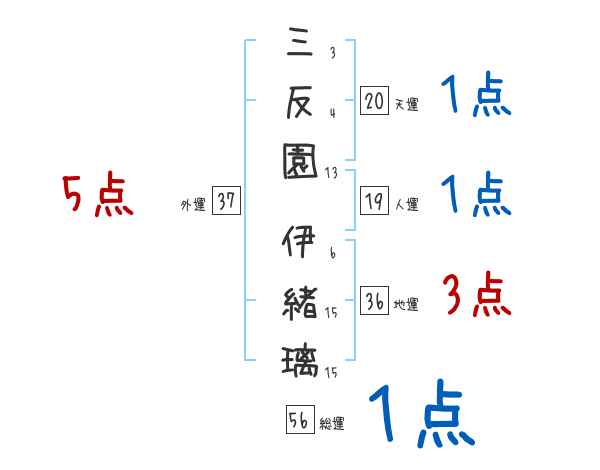総運![]() | 三反園伊緒璃さんの総運は56画の1つ星!消極的で無気力になりがち。誠実な気持ちが必要でしょう。 あなたの人生を表す1番重要な運勢です。生涯を通じて影響する総合運となり、主に50歳以降の晩年期に影響を及ぼします。 |