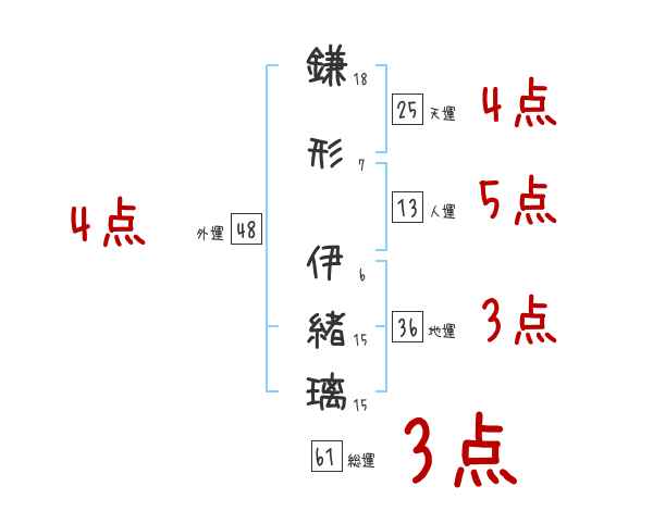 天運![]() | 鎌形伊緒璃さんの天運は25画の4つ星!個性があり才能があふれる。強運の持ち主で発展する。 家系が持つ宿命的な運勢を表します。祖先から受け継いだ苗字ですので自分の力が及びません。家柄を象徴します。 |