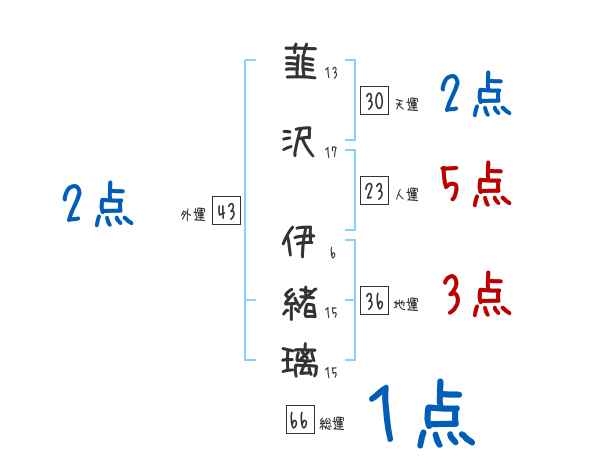 人運![]() | 韮沢伊緒璃さんの人運は23画の5つ星!想像力に優れ活力がある。一代で成功し名誉を手に入れる。 性格や才能などを表す2番目に重要な運勢です。人間関係や協調性、社会的な成功に影響します。主に20歳から50歳ぐらいまでの中年期の運勢を表します。 |