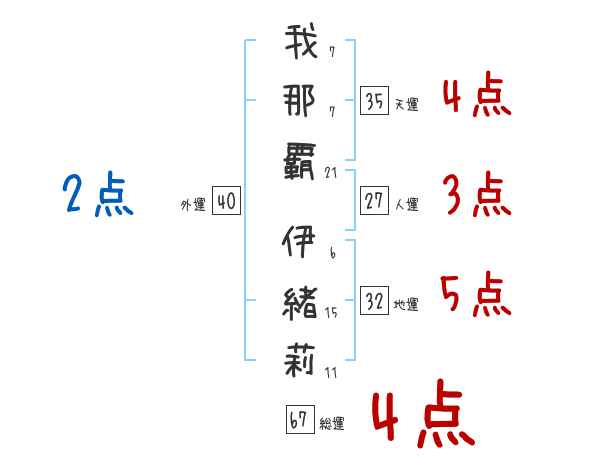 総運![]() | 我那覇伊緒莉さんの総運は67画の4つ星!幸運な人生。堅実な性格で調和し、周りの人に助けられる。 あなたの人生を表す1番重要な運勢です。生涯を通じて影響する総合運となり、主に50歳以降の晩年期に影響を及ぼします。 |