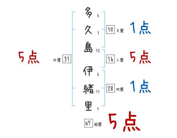 総運![]() | 多久島伊緒里さんの総運は47画の5つ星!実力が開花し発展する円満な人生。財に恵まれる。 あなたの人生を表す1番重要な運勢です。生涯を通じて影響する総合運となり、主に50歳以降の晩年期に影響を及ぼします。 |