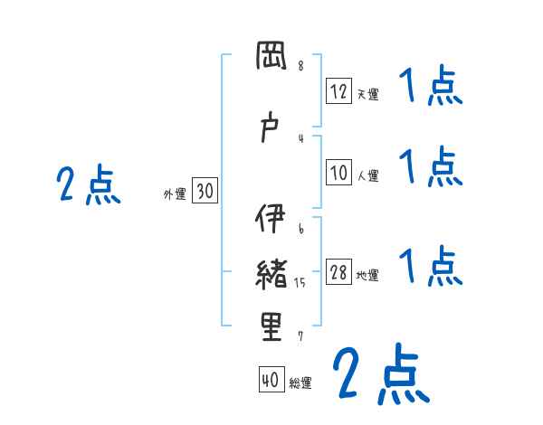 天運![]() | 岡戸伊緒里さんの天運は12画の1つ星!簡単な失敗で諦めてしまいやすいかも。着実に行動すると良いでしょう。 家系が持つ宿命的な運勢を表します。祖先から受け継いだ苗字ですので自分の力が及びません。家柄を象徴します。 |