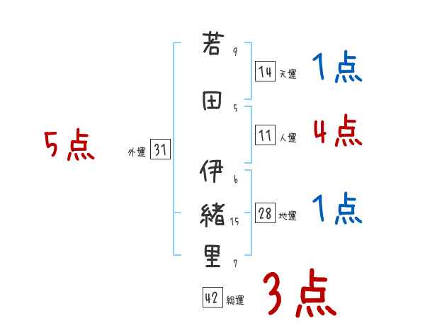 天運![]() | 若田伊緒里さんの天運は14画の1つ星!人に対して優しいがストレスを溜め込みがち。人間関係のトラブルを避けるよう気をつけましょう。 家系が持つ宿命的な運勢を表します。祖先から受け継いだ苗字ですので自分の力が及びません。家柄を象徴します。 |