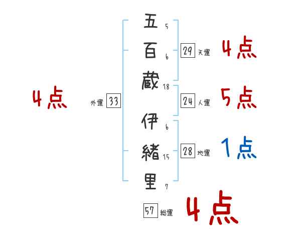 天運![]() | 五百蔵伊緒里さんの天運は29画の4つ星!完全主義で才能がある。厳格な心の持ち主。 家系が持つ宿命的な運勢を表します。祖先から受け継いだ苗字ですので自分の力が及びません。家柄を象徴します。 |