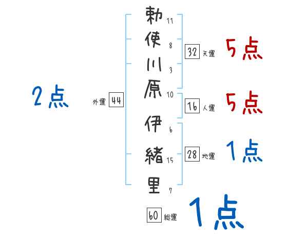 天運![]() | 勅使川原伊緒里さんの天運は32画の5つ星!柔軟性があり成功する。チャンスが多く金運が良い。 家系が持つ宿命的な運勢を表します。祖先から受け継いだ苗字ですので自分の力が及びません。家柄を象徴します。 |