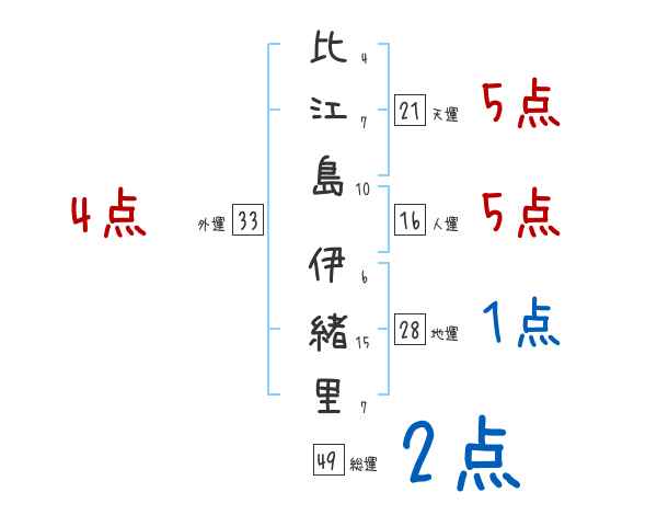 外運![]() | 比江島伊緒里さんの外運は33画の4つ星!権力志向でプライドが高い。勇気があり運を切り開き成功する。 生活面を象徴する運勢です。外部から受ける影響力を表し、結婚運、家庭運や職場、環境への順応性を表します。 |