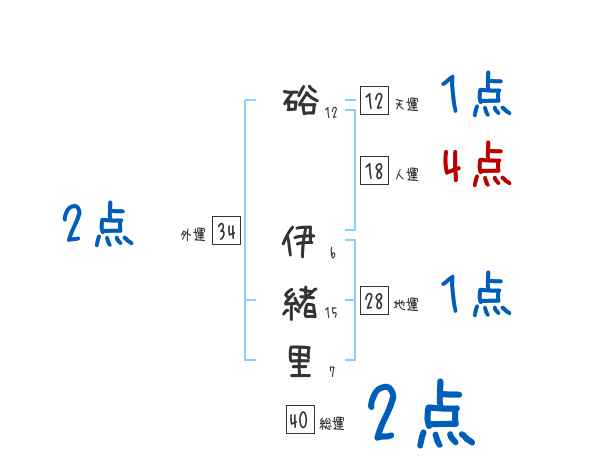 天運![]() | 硲伊緒里さんの天運は12画の1つ星!簡単な失敗で諦めてしまいやすいかも。着実に行動すると良いでしょう。 家系が持つ宿命的な運勢を表します。祖先から受け継いだ苗字ですので自分の力が及びません。家柄を象徴します。 |