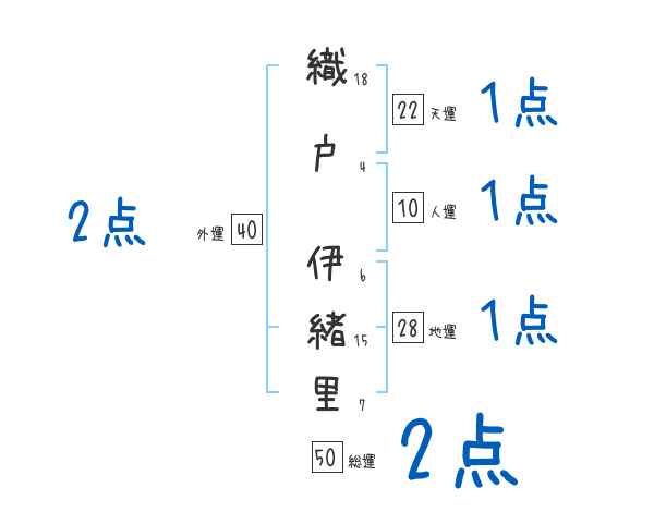 外運![]() | 織戸伊緒里さんの外運は40画の2つ星!自信過剰で物事に固執するためトラブルに注意。 生活面を象徴する運勢です。外部から受ける影響力を表し、結婚運、家庭運や職場、環境への順応性を表します。 |