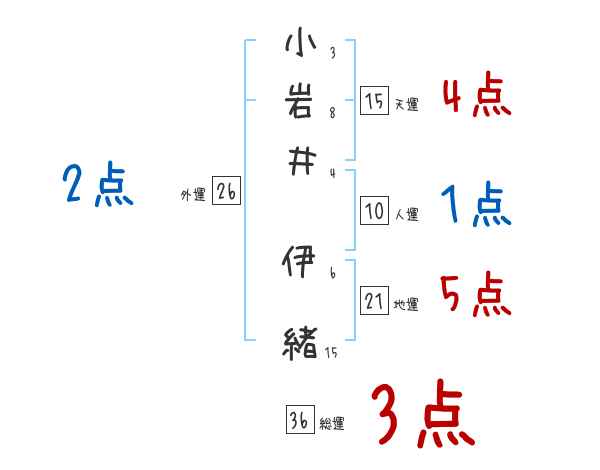 外運![]() | 小岩井伊緒さんの外運は26画の2つ星!波瀾万丈かも。信頼できる人を大事にしましょう。 生活面を象徴する運勢です。外部から受ける影響力を表し、結婚運、家庭運や職場、環境への順応性を表します。 |