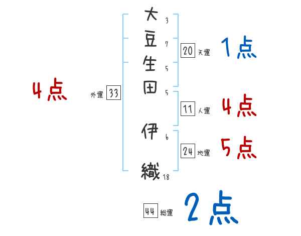 総運![]() | 大豆生田伊織さんの総運は44画の2つ星!誠実で慎重な性格。物事を考えすぎないように注意しましょう。 あなたの人生を表す1番重要な運勢です。生涯を通じて影響する総合運となり、主に50歳以降の晩年期に影響を及ぼします。 |