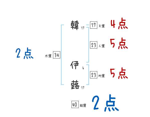 人運![]() | 韓伊蕗さんの人運は23画の5つ星!想像力に優れ活力がある。一代で成功し名誉を手に入れる。 性格や才能などを表す2番目に重要な運勢です。人間関係や協調性、社会的な成功に影響します。主に20歳から50歳ぐらいまでの中年期の運勢を表します。 |