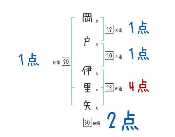 天運![]() | 岡戸伊里矢さんの天運は12画の1つ星!簡単な失敗で諦めてしまいやすいかも。着実に行動すると良いでしょう。 家系が持つ宿命的な運勢を表します。祖先から受け継いだ苗字ですので自分の力が及びません。家柄を象徴します。 |
