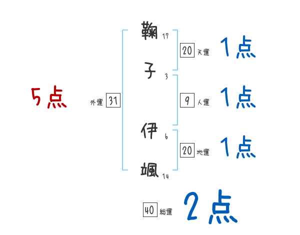外運![]() | 鞠子伊颯さんの外運は31画の5つ星!社交性があり判断力に優れる。順風満帆な人生で円満な生活。 生活面を象徴する運勢です。外部から受ける影響力を表し、結婚運、家庭運や職場、環境への順応性を表します。 |